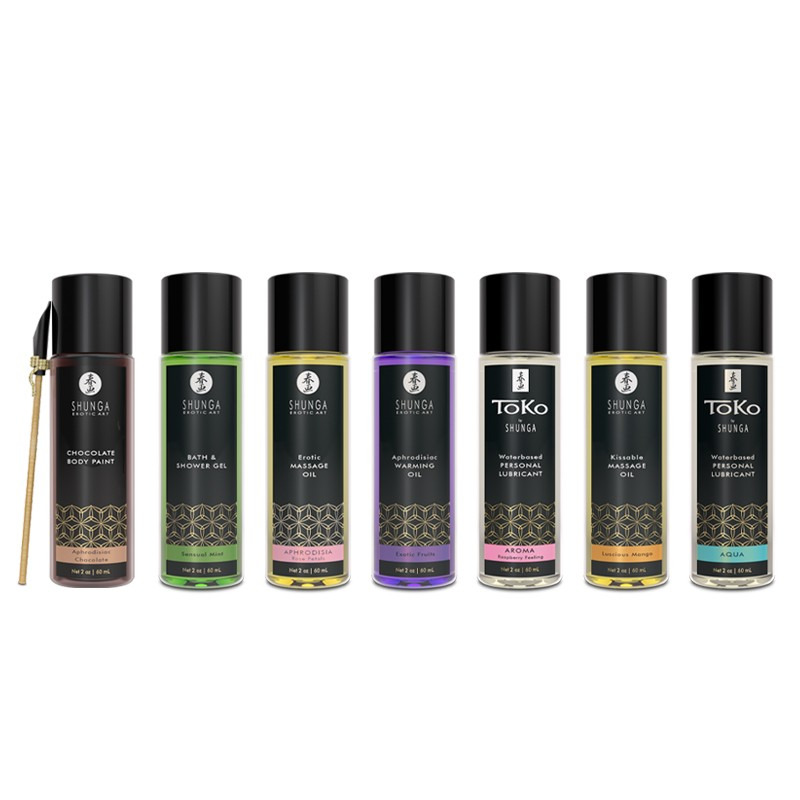 Lubricantes, aceites de masaje, estimulantes, una bala vibradora… ¡una cuidadísima selección de 25 productos en tamaño estándar y tamaño viaje!